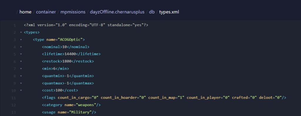 Thetypes.xmlfile located in/mpmissions/dayzOffline.YOURMAPNAME/db/defines loot spawns and behavior. - Can I edit the loot table for different maps?