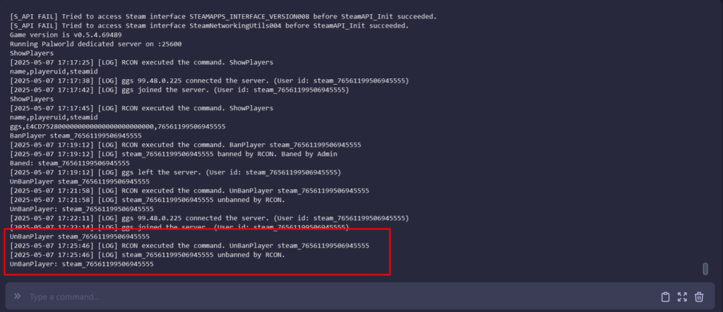 3. Copy the Steam ID of the user you wish to kick, and use the following command UnBanPlayer steam_<Steam ID here>.