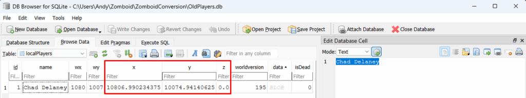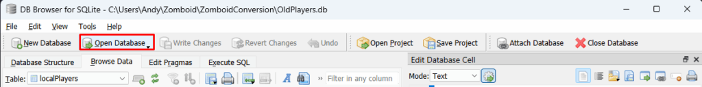 3. Click Browse Data, then select the localPlayers table. If there is player data here, this confirms it’s a singleplayer-format players.db