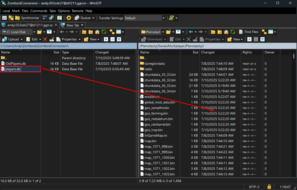 1. In yourFiles panel, delete the existing players.db file to avoid format conflict.