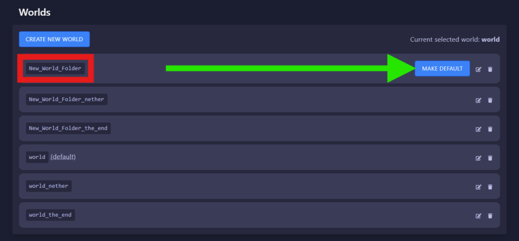 Worldssection in your main Pterodactyl page, then select the new world folder you just added in the list, then click onMake Default.