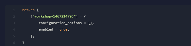 Each mod entry should match its Steam Workshop ID, and you can customize configuration_options if needed.