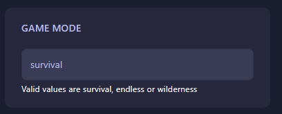 Game Mode, change it, and you are ready to start the server! - Valid values are survival, endless or wilderness