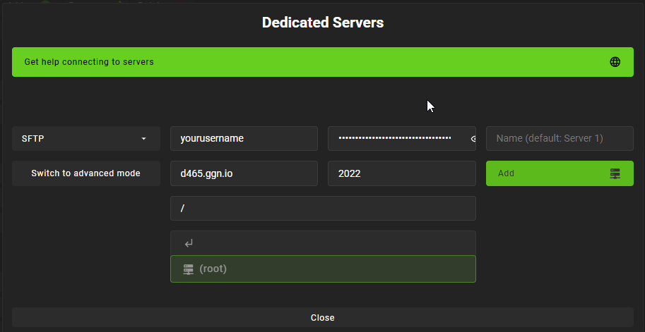 - Here’s another example with how the details should be filled: sftp://ggservers.8dj8sd2:YourPasswordHere.@51.195.4.194:2022/