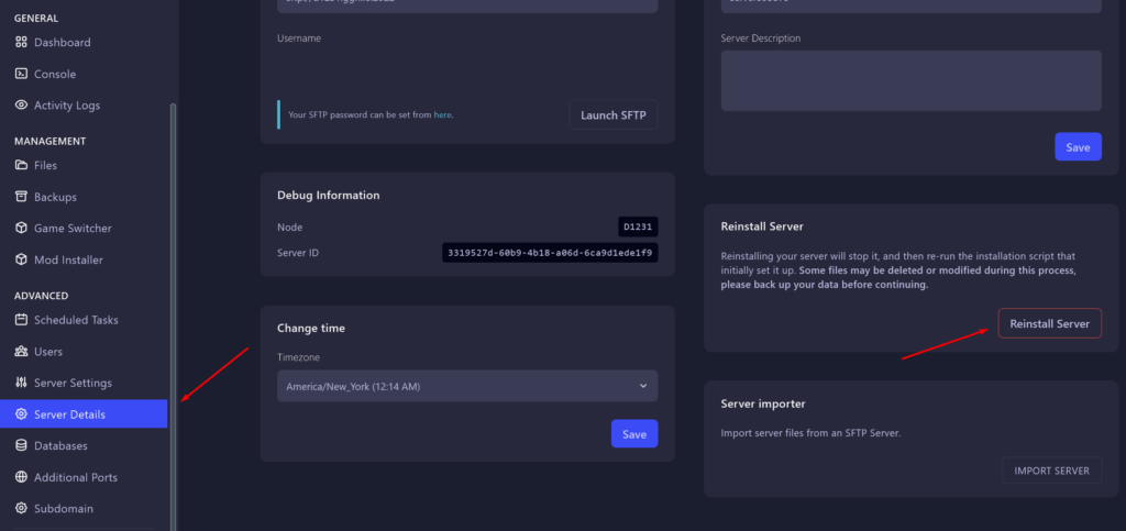Server Detailsbutton and thenReinstall Serverto install the latest server files.