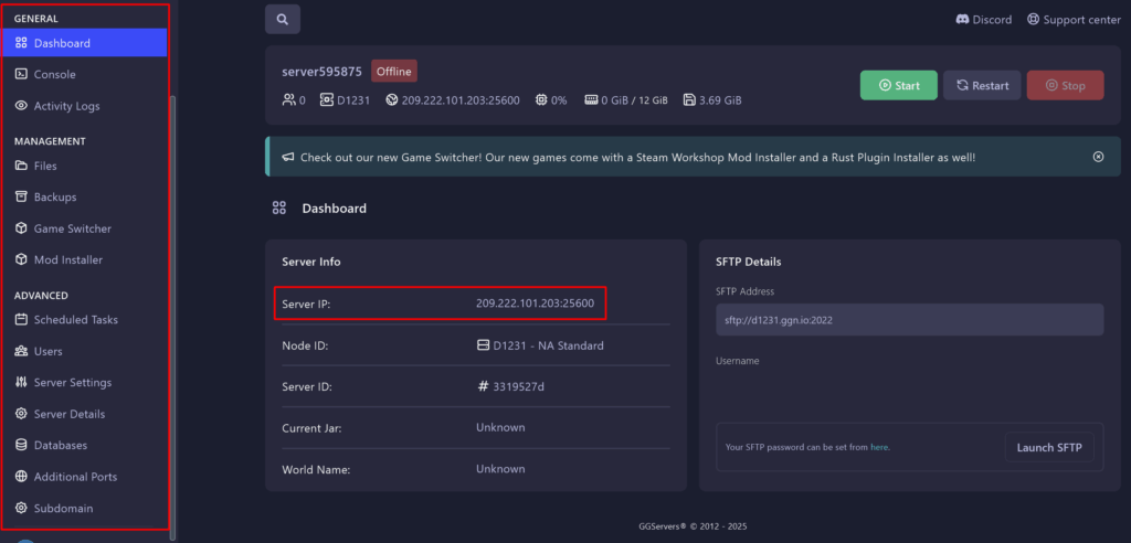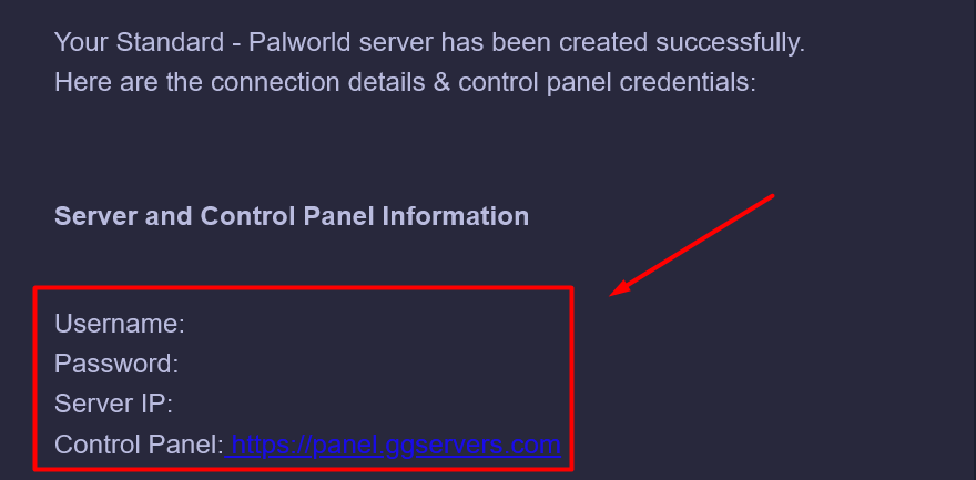 Your Game Server Details, and you’ll see your server information and the game server panel credentials!