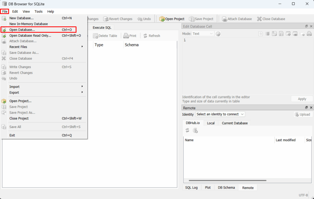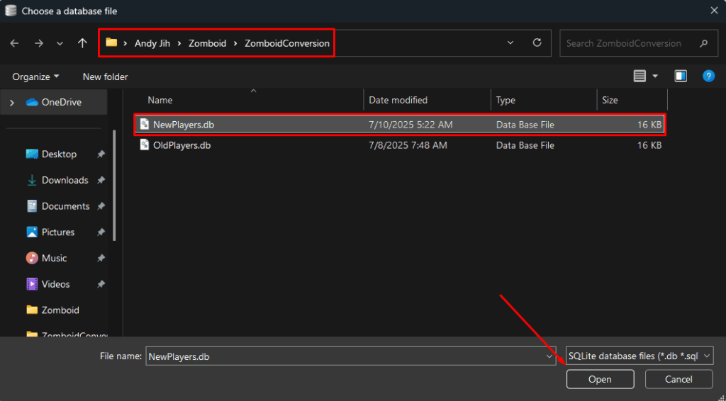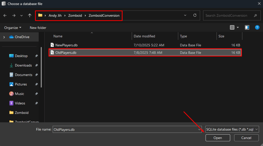 2. Open OldPlayers.db in DB Browser from File > Open Database.