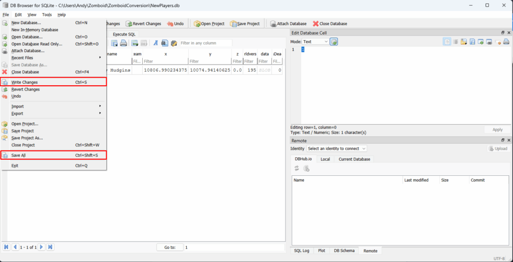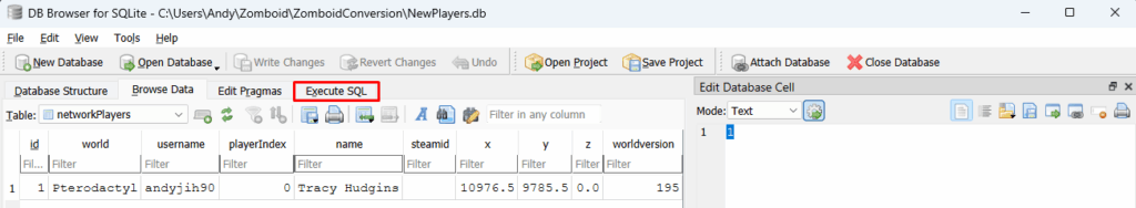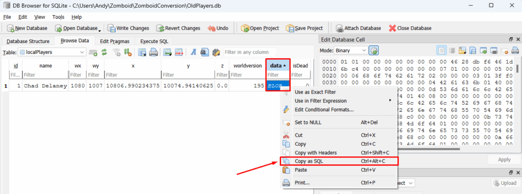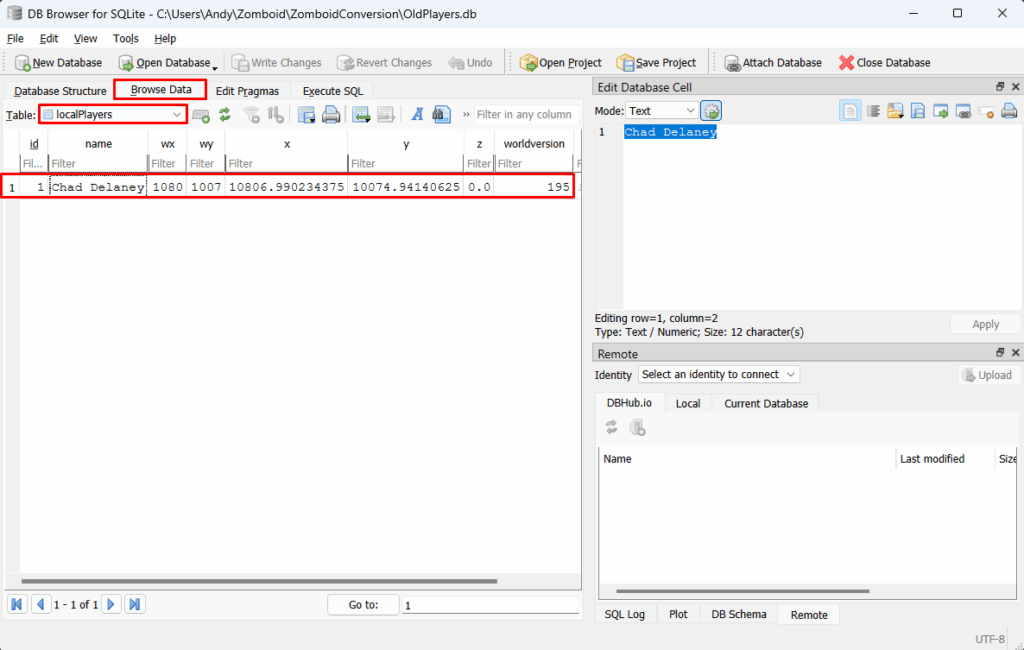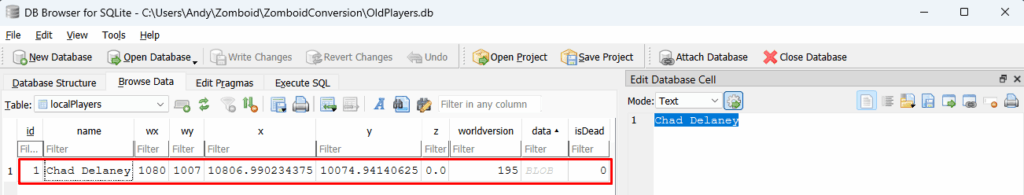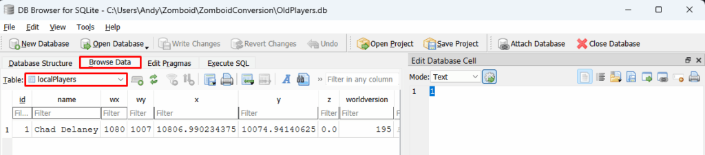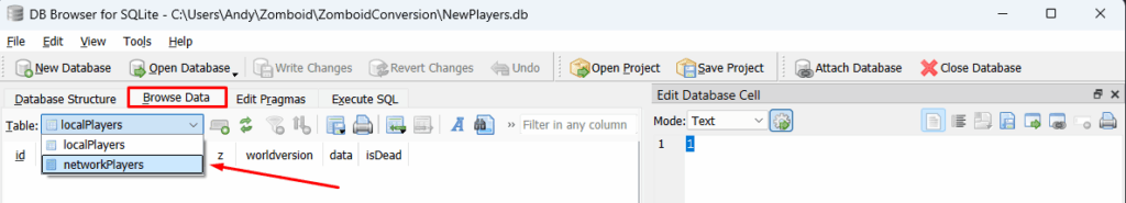 3. Click Browse Data, then select the localPlayers table. If there is player data here, this confirms it’s a singleplayer-format players.db