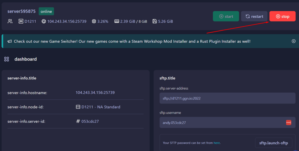 1. Login to your server panel and stop your server. If you aren’t sure how to login checkout this guide here.