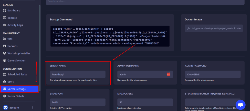 2. On your server panel, go to Server Settings and note the Server Name (this is what your server uses to identify world folders).