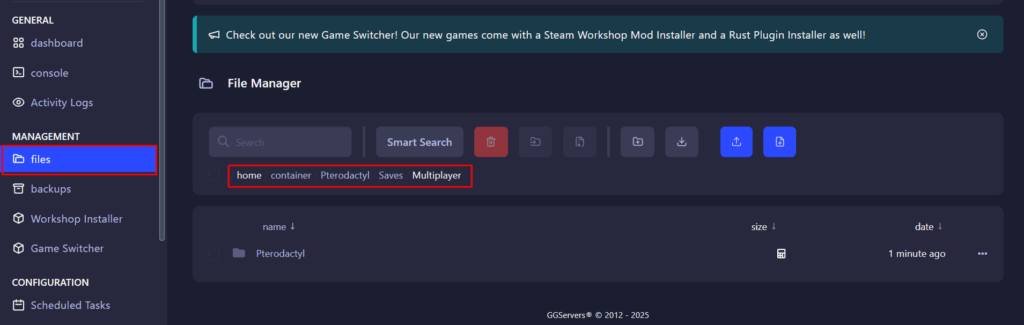 3. Click on Files, and go to Pterodactyl/Saves/Multiplayer