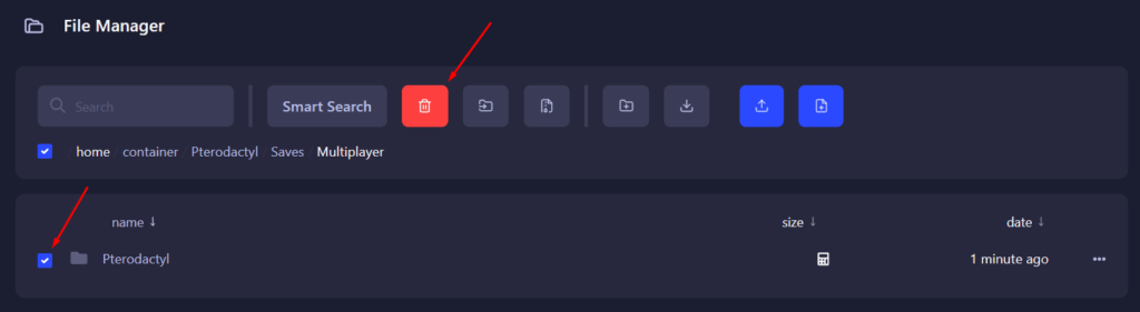 4. Select and delete your world folder, it will be called Pterodactyl by default.