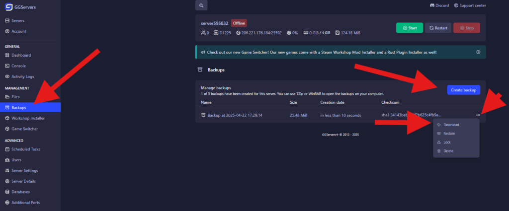 - Log into your server’s Control Panel and STOP the server.