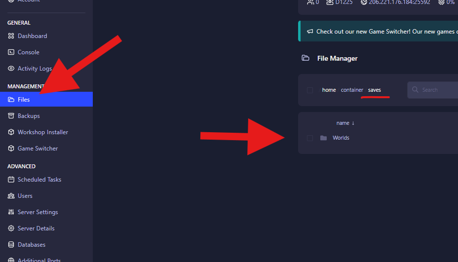 - Head to the Files section and open the /Saves/Worlds/ folder.