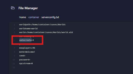 serverconfig.txtfile. - Locate the Autocreate setting and select your preferred world size.
