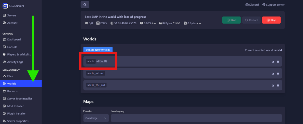 Worldssection in your main Pterodactyl page, then select the new world folder you just added in the list, then click onMake Default.