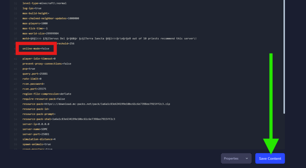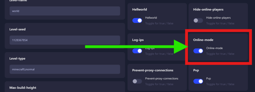 - Find Online-mode and switch the box to enable or disable, save and start your server.