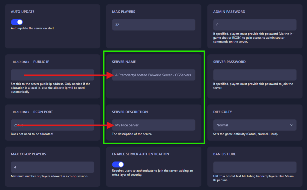 4. Find theServer Name andServer Description settings and change it to whatever you would like!