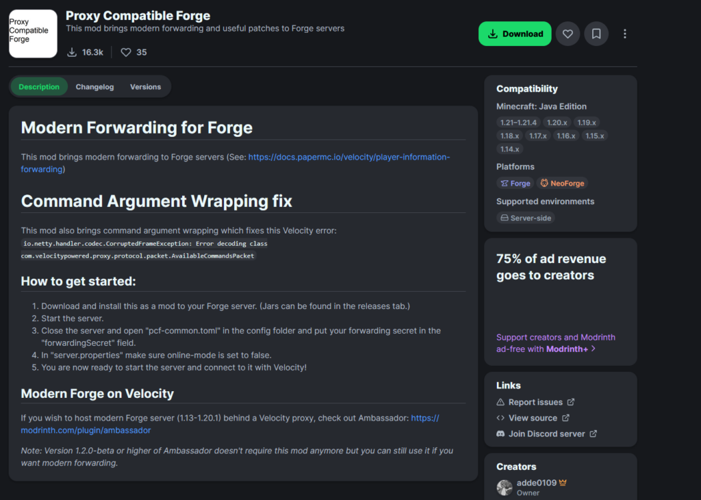 This mod helps bridge the gap between Forge servers and Velocity proxies by enabling modern forwarding, UUID support, and more. It’s essential for ensuring player identity and connection stability.