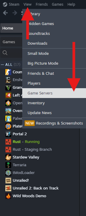To access your server via Steam, first go to View then click on Game Servers.