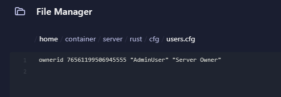 /home/container/server/rust/cfg/users.cfg - Add your SteamID64 using this format: