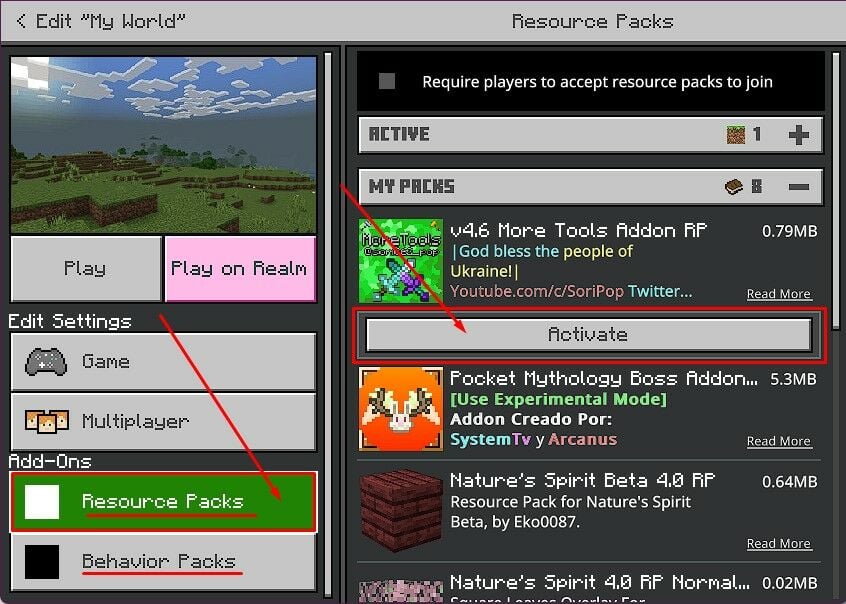 Resource PacksorBehaviors Packsdepending on what pack you want to load, and then click onActivateto add them to your world.