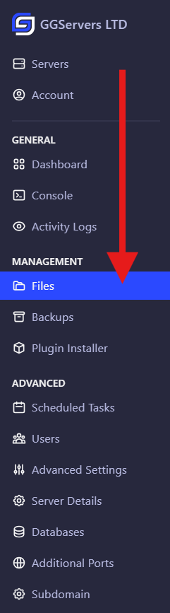 - On your server dashboard, click Files located on the left-side navigation menu.
