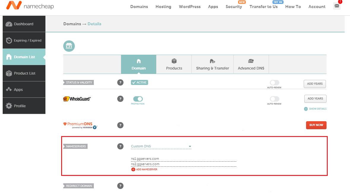 - Now that you’re inside your domain’s settings page, you’ll need to set up the nameservers.