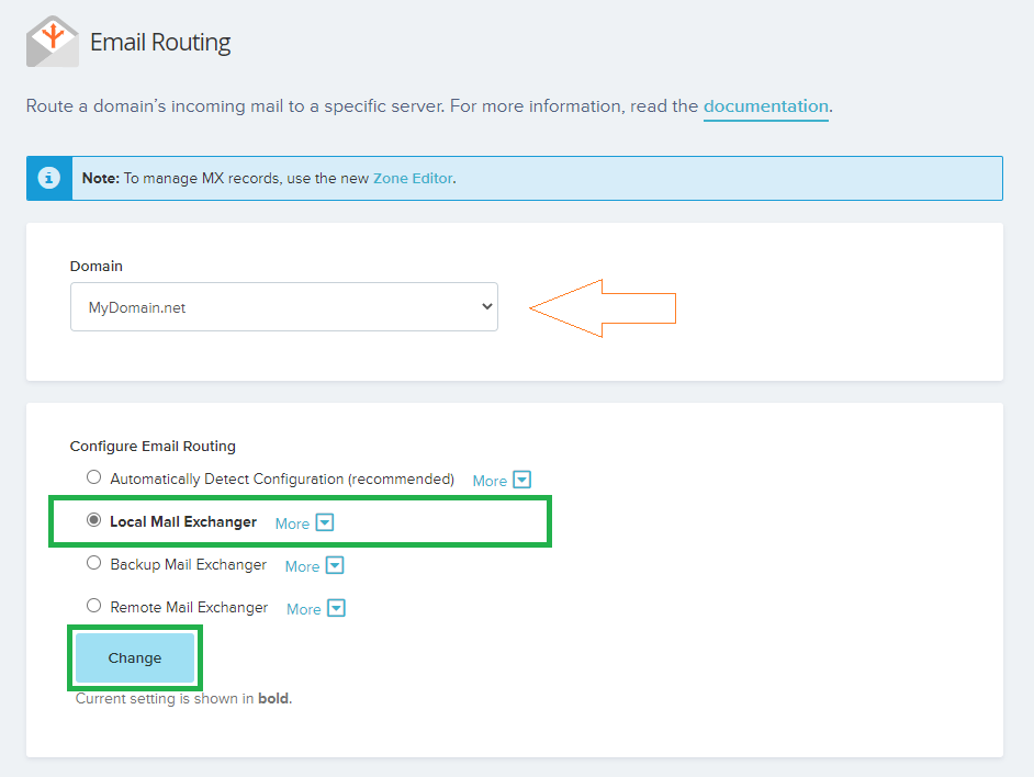 - Select your wished domain you’d like to change the email routing settings, set to ” Local Mail Exchanger ” and click on the ” Change ” button.