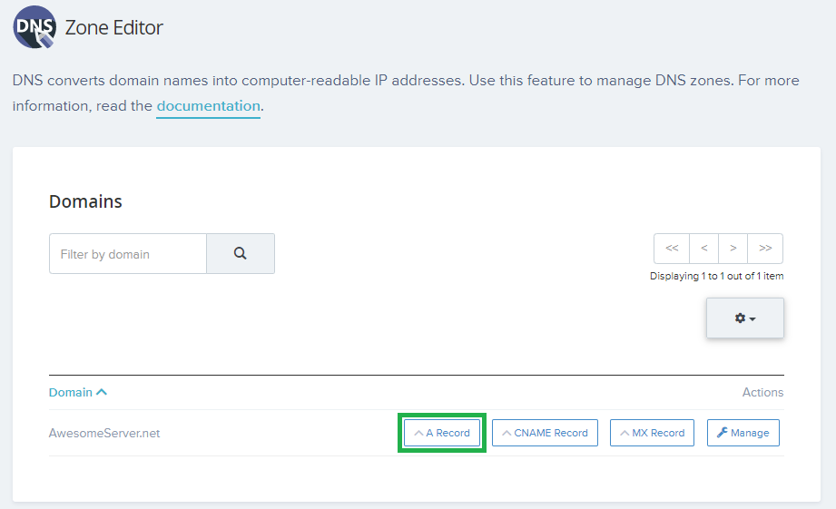 Once you’ve connected your Nameservers you can use the ” Zone Editor ” tool available on cPanel to create an A Record for your Server IP.