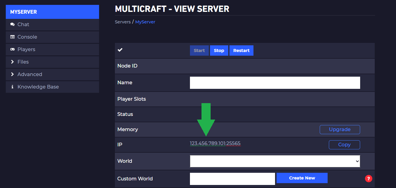 On the example below the Server IP is 123.456.789.101 and the Server Port is 25565.