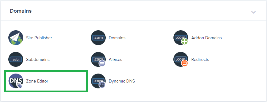Scroll down to ” Domains ” and click on the DNS ” Zone Editor “.