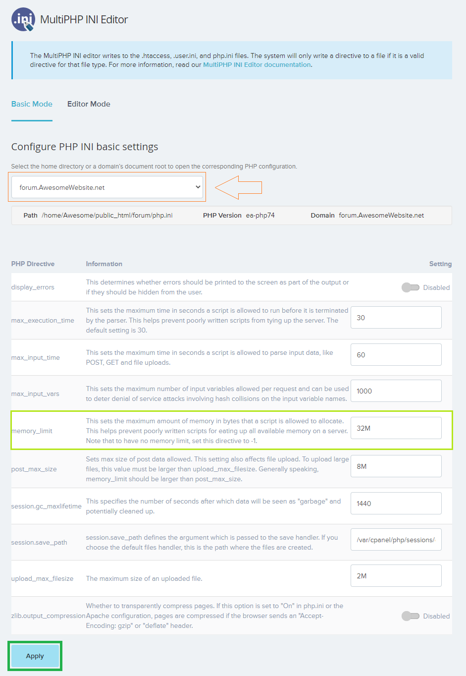 - Select your wished domain/subdomain you’d like to change the PHP Setting.