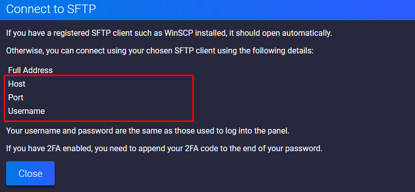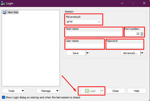 New Sessionbutton. Aloginwindow will appear. SelectSFTPas theFile protocol, then paste your credentials there (Host,Port,Username, andPassword) and click on theLoginbutton. The password you need to use is your game server panel password.
