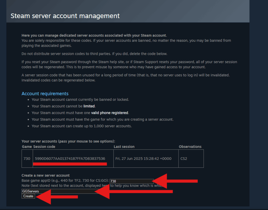 - Your Steam account must have the game for which you are creating a server account.