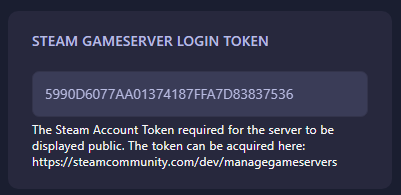 The Steam Account Token required for the server to be displayed public. The token can be acquired here: https://steamcommunity.com/dev/managegameservers.