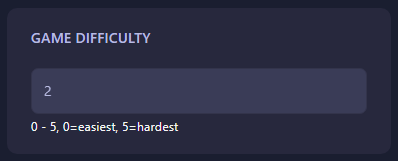 This option sets the server’s game difficulty. Goes from 0 to 5, where 0 represents easiest, and 5 represents hardest:
